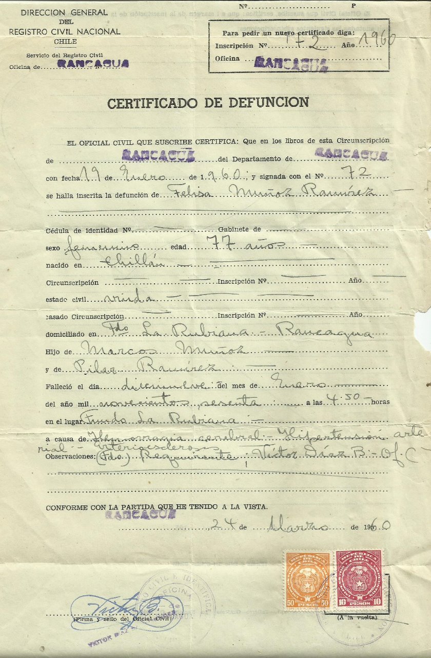 Francois Le Naour falleció a los 54 años, el 9 de abril de 1917, a las 9.30 hrs. en el Sanatorio Alemán de Concepción. Felisa ( Felicita ) Munoz Ramirez ( La Gran Mamá ) falleció a los 77 años, el 19 de enero de 1960, a las 4.50 hrs. en el fundo La Rubiana, Rancagua. Francois y esposa descansan en paz en el Cementerio de la ciudad de Victoria, junto a su hijo Francisco.