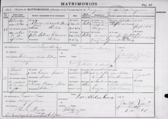 Acta de Matrimonio Francois Louis Le Naour con Felisa Munoz Ramirez año 1892